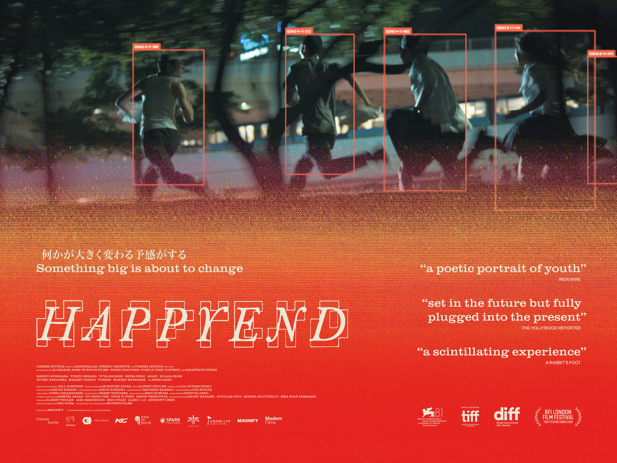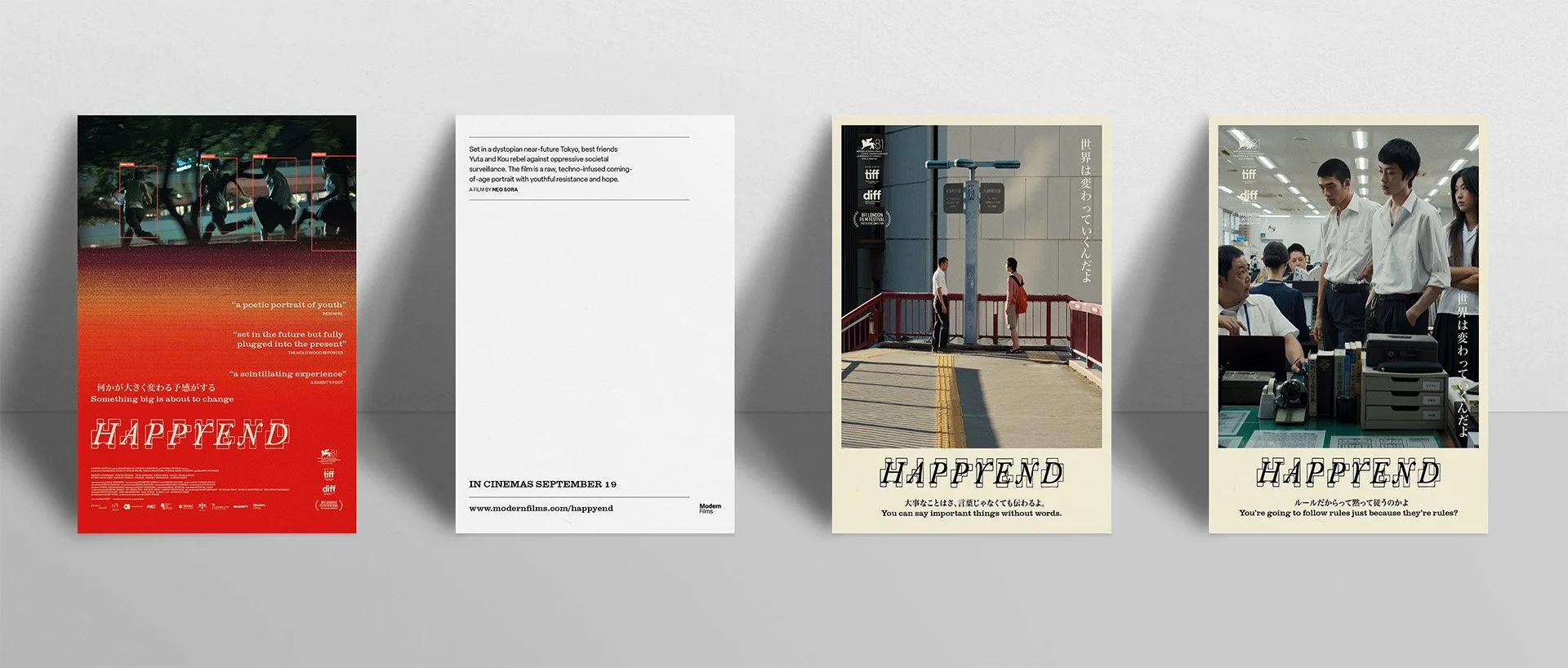 Happyend Working with Modern Films to create the UK campaign for Neo Sora’s film about a near-future set Tokyo where the threat of a catastrophic earthquake pervades daily life, two rabble-rousing best friends are about to graduate high school. ServicesKey Art Creative Direction